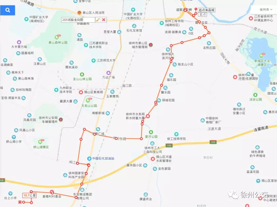 為滿足廣大市民出行需求,進一步擴大徐州高新區(qū)和市區(qū)的交通線網(wǎng),促進區(qū)域交通和諧發(fā)展,為更多的市民提供便捷的城市客運服務,徐州公交開通了205路線,并于12月18日上午8:30分開始試運行。具體線路走向及停靠站點如下: