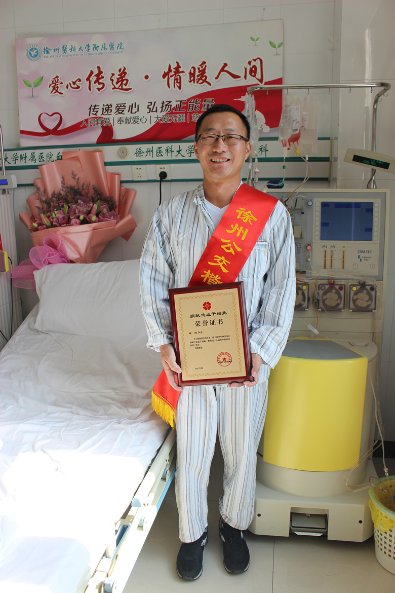 2018年10月30日上午8時許,徐州醫(yī)科大學(xué)附屬醫(yī)院血液科,37歲的公交小伙兒鄭剛異常平靜地躺在病床上,殷紅的鮮血汩汩從兩只手臂上連接著不停運(yùn)轉(zhuǎn)地造血干細(xì)胞采集機(jī)器的針管間流淌,經(jīng)約3小時的采集,這份帶著濃濃深情和殷切希望、143毫升的造血干細(xì)胞混懸液,將為一名3歲白血病男孩送去生命的火種。鄭剛也成為徐州公交系統(tǒng)首例、徐州市第77例造血干細(xì)胞的捐獻(xiàn)者。