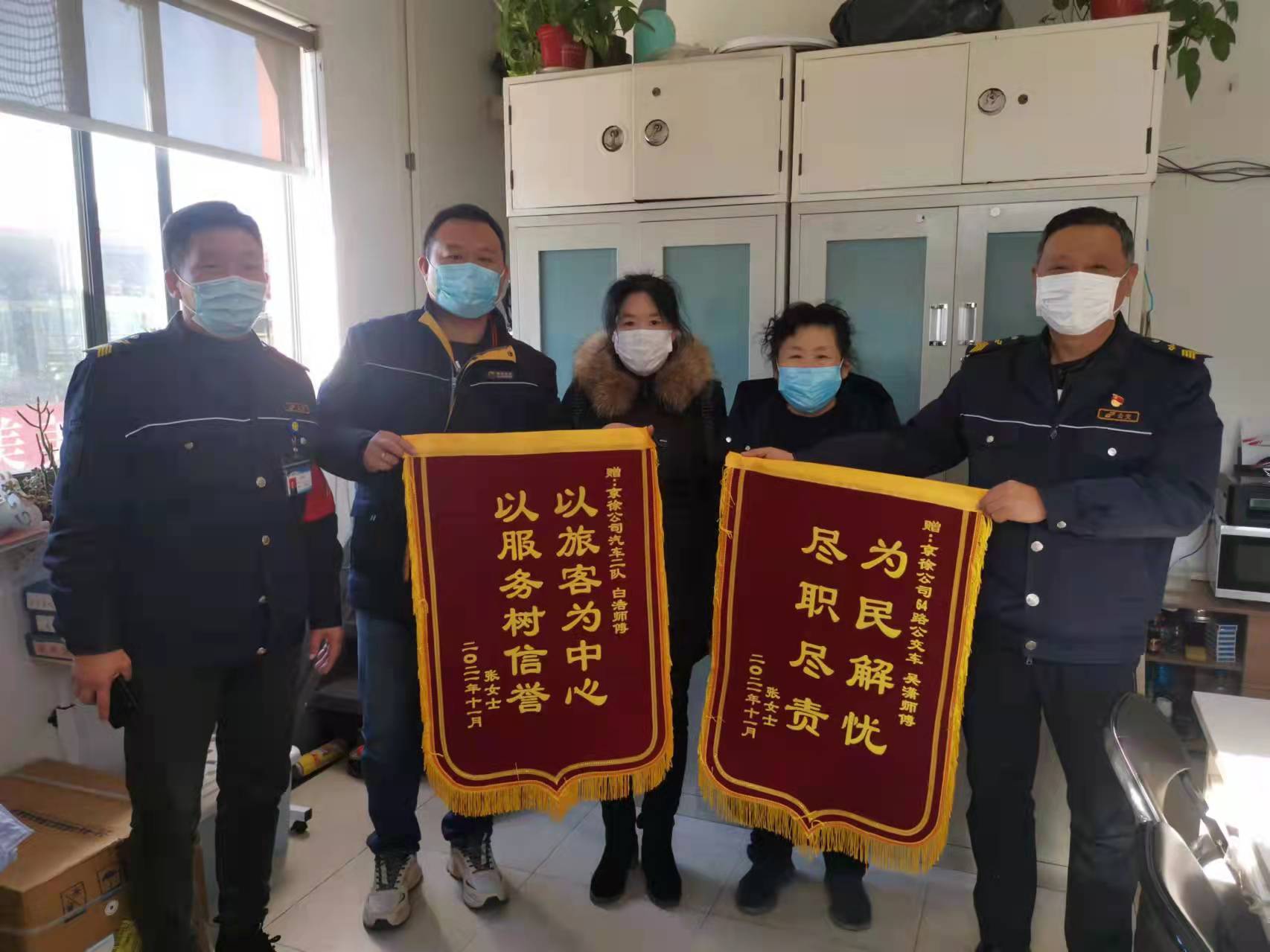 11月11日上午,乘客張女士帶著兩面錦旗來到食品城車隊(duì),感謝64路駕駛員吳瀟和現(xiàn)場(chǎng)調(diào)度白浩。