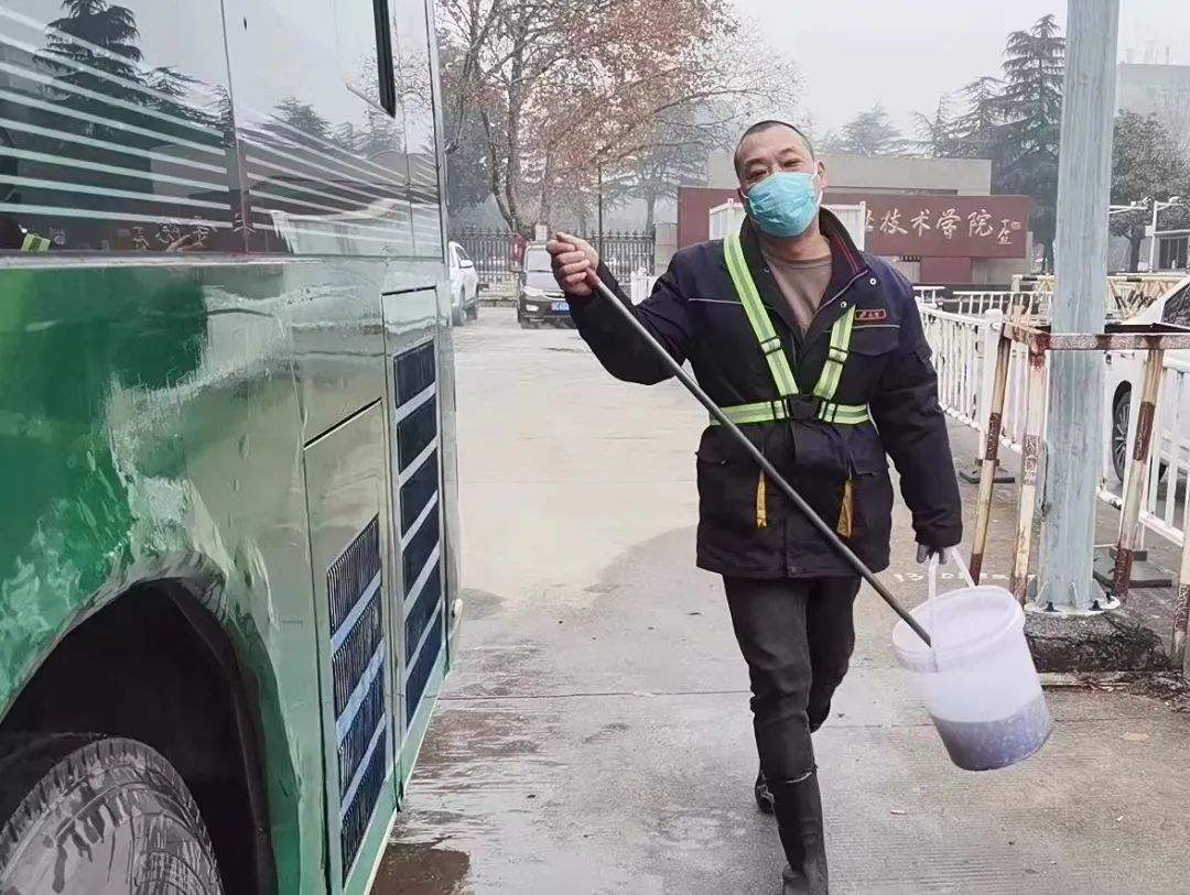 春運(yùn)期間,為保障廣大市民乘客出行需求,部分公交線(xiàn)路縮短了發(fā)車(chē)時(shí)間,增加了運(yùn)營(yíng)車(chē)輛,再加上客流增多,路面擁堵等情況,公交車(chē)回到終點(diǎn)站停放的時(shí)間很短,又要投入到下一趟的運(yùn)營(yíng)當(dāng)中,這無(wú)疑給車(chē)輛保潔工作帶來(lái)了一定的困難。因此,為確保出場(chǎng)車(chē)輛干凈整潔,每天天沒(méi)亮,張璞已經(jīng)在建筑學(xué)院停車(chē)場(chǎng)里忙起來(lái)了。只見(jiàn)他一手拿毛刷,一手拎水桶,開(kāi)始清潔車(chē)廂外部,張璞動(dòng)作嫻熟地擦拭前擋風(fēng)玻璃、車(chē)廂外部?jī)蓚?cè),不一會(huì),他的臉上就已掛滿(mǎn)了汗珠,平均一輛車(chē)10分鐘的清潔時(shí)間,是他十多年工作鍛煉出來(lái)的速度。近日氣溫驟降,持續(xù)有冰凍天氣,如果抹布太濕,早晨擦座椅時(shí)會(huì)粘在上面,為此張璞都會(huì)提前準(zhǔn)備好潮濕的抹布,既能擦掉扶手、座椅、靠背上的浮塵,還不會(huì)留下水漬。像這樣日復(fù)一日的簡(jiǎn)單工作,張璞堅(jiān)持了十多年,他平均每天要打掃23臺(tái)車(chē),平均一輛車(chē)10分鐘的清潔時(shí)間,張璞用自己的勞動(dòng),換來(lái)了車(chē)輛的干凈整潔。